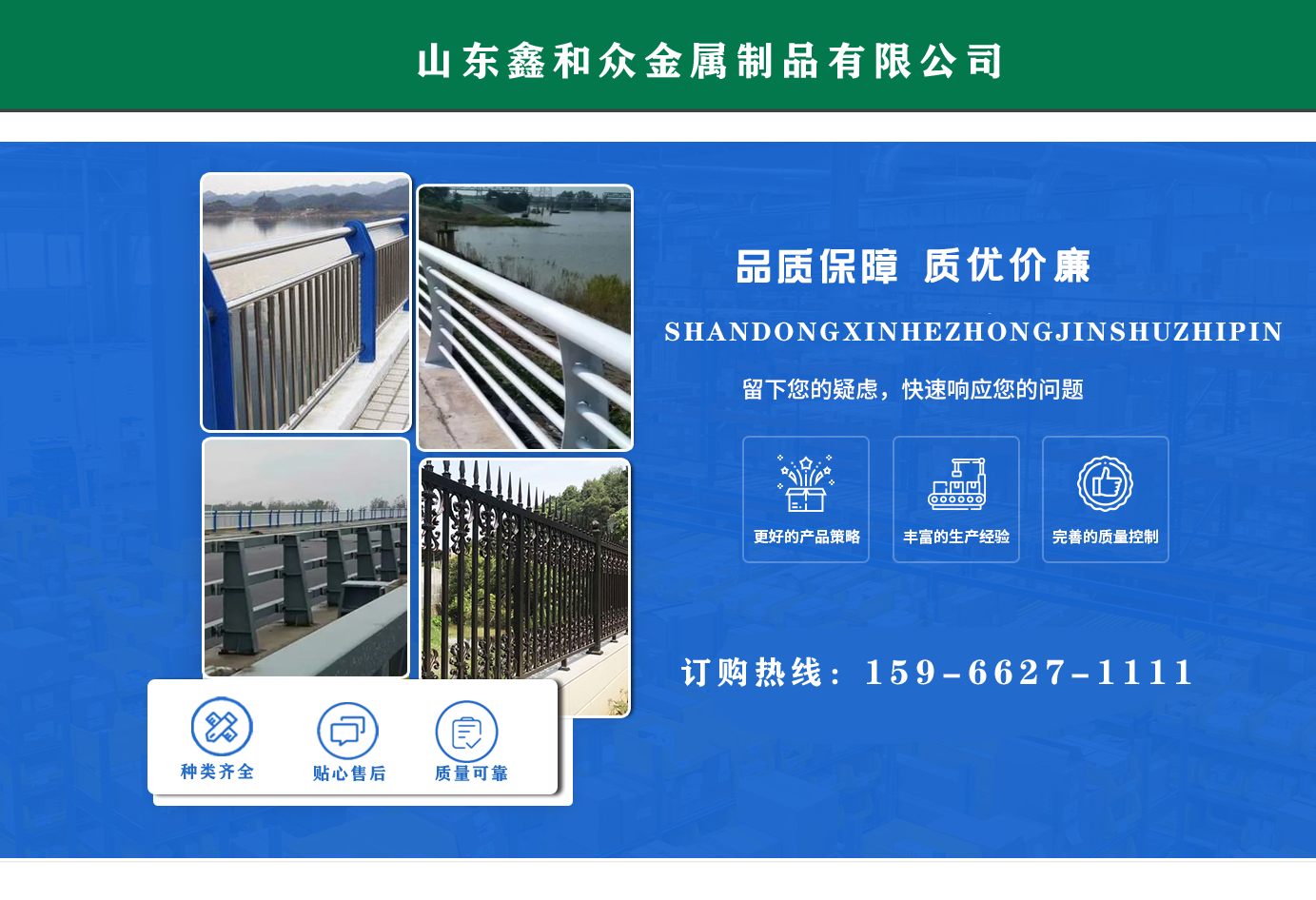 山東鑫和眾金屬制品有限公司主要產(chǎn)品有防撞護欄,橋梁護欄,道路護欄,河道護欄,不銹鋼護欄等護欄。提供設(shè)計方案,一站式定制,包您滿意價格優(yōu)惠,歡迎來電咨詢! 公司常年從事銷售護欄防撞護欄,橋梁護欄,道路護欄,河道護欄,不銹鋼護欄,橋梁鋼護欄,河道燈光護欄等。產(chǎn)品廣泛應用于橋梁、河道、旅游景區(qū)、道路、公路、公園、小區(qū)、景觀、道路防撞等領(lǐng)域?! 」井a(chǎn)品均采用優(yōu)質(zhì)不銹鋼材料,符合相關(guān)標準。各種型號不銹鋼復合管及護欄,質(zhì)量嚴格把控。產(chǎn)品強度高、耐腐蝕、焊接牢固、抗沖擊、性能好,防撞護欄結(jié)構(gòu)簡單、美觀實用大方。 歡迎前來訂購!...